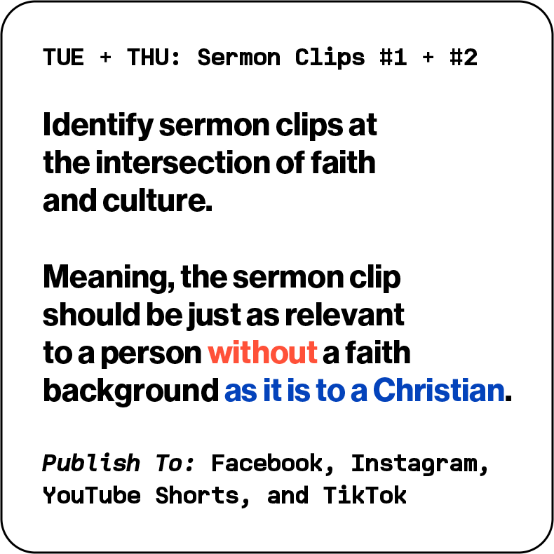 Identify sermon clips at the intersection of faith and culture. Meaning, the sermon clip should be just as relevant to a person without a faith background as it is to a Christian.
