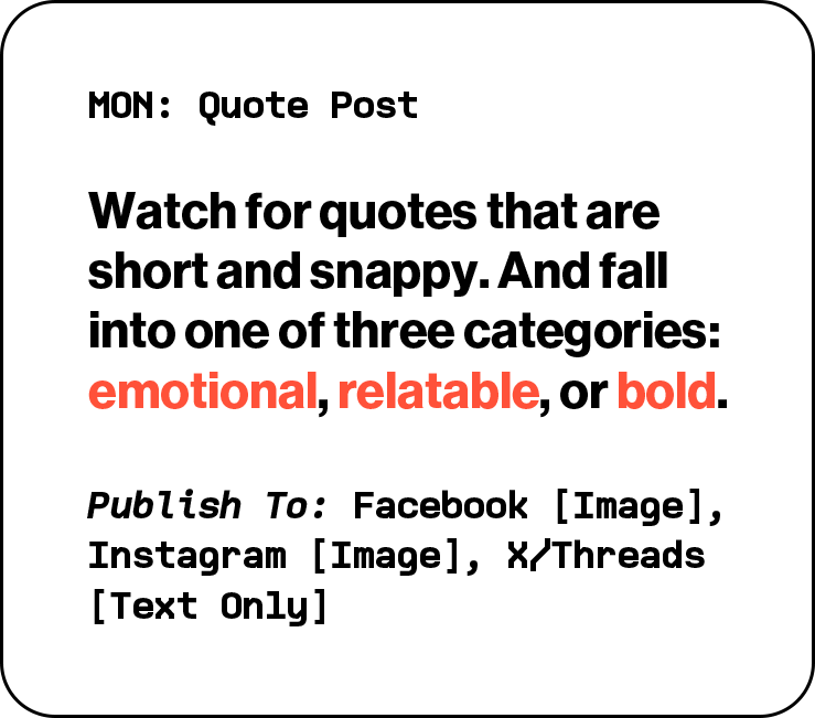 Watch for quotes that are short and snappy. And fall into one of three categories: emotional, relatable, or bold.