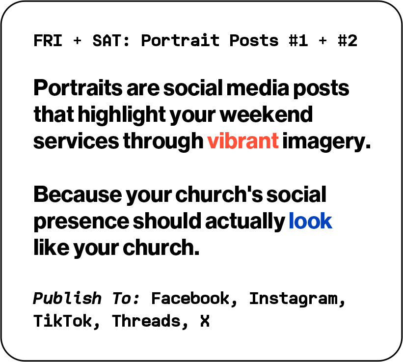 Portraits are social media posts that highlight your weekend services through vibrant imagery. Because your church's social presence should actually look like your church.